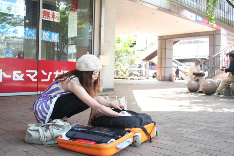 小倉駅前でイソイソ荷物整理。